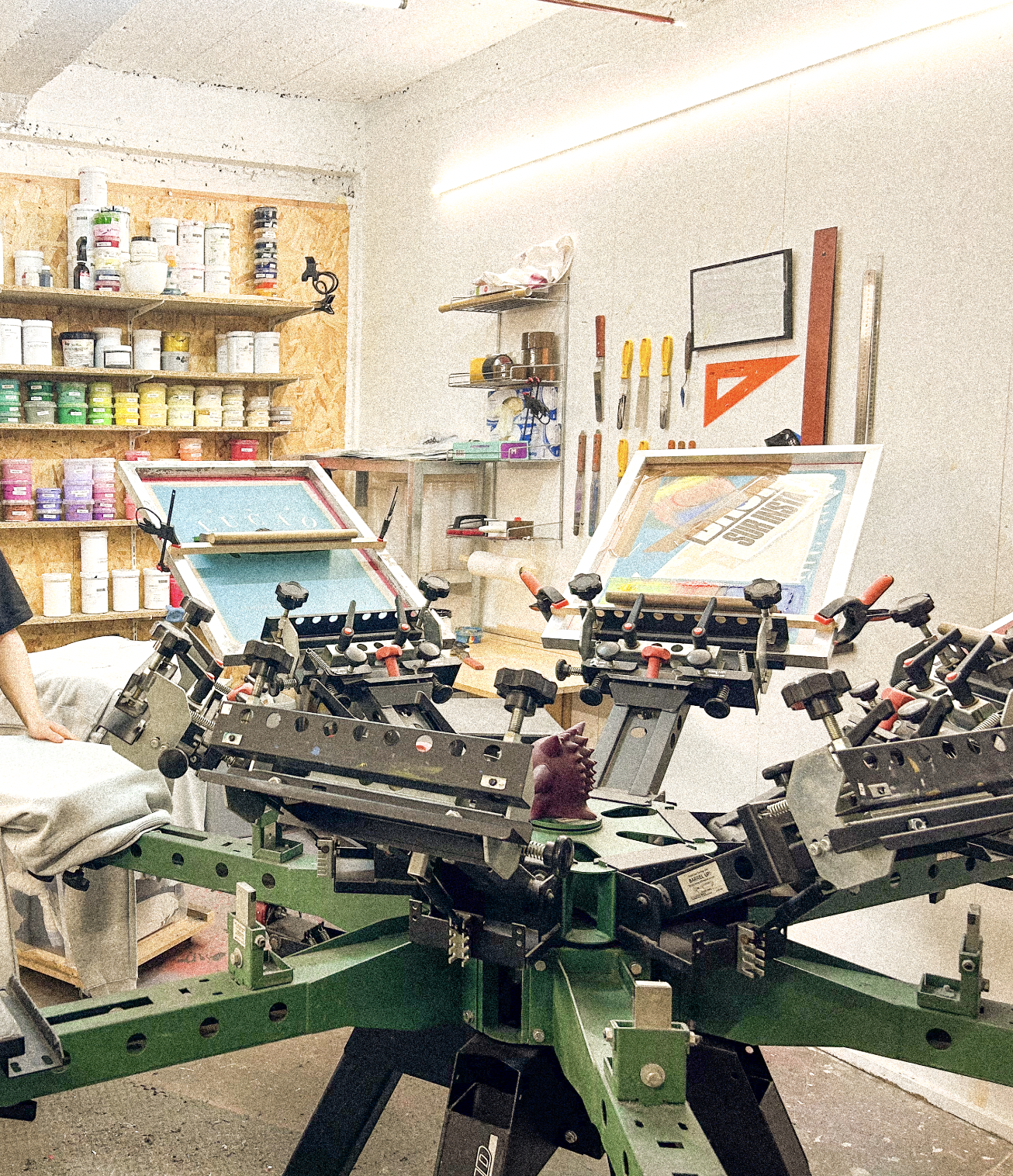 Imprimé à Bruxelles, en Belgique, dans un atelier de sérigraphie spécialisé dans le textile, tenu par deux personnes : Toma (imprimeur et graphiste) et Domi (imprimeur, community manager et couturière). Leur travail au quotidien consiste à aider les jeunes, comme moi, à lancer leur projet… mais pas seulement ! J’ai la chance de collaborer avec eux, ce qui me permet de constater leur soin dans le choix des textiles. Ce sont aussi des personnes à l’écoute, généreuses et passionnées !